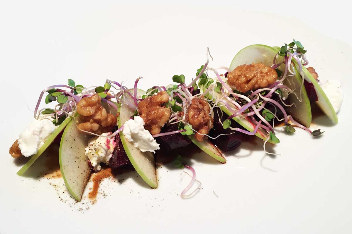 Salade van bietjes, appels, walnoten en buffelmozzarella